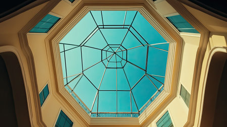 Stunning octagonal skylight captures natural light and views of the clear blue sky, showcasing modern architectural design and elegant symmetry in an indoor setting.