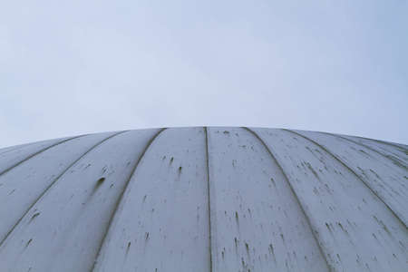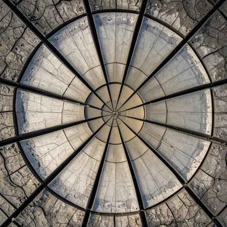 From a low angle perspective, the camera captures the powerful symmetry of a weathered industrial dome.