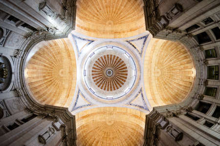 LISBON, PORTUGAL - FEBRUARY 2, 2019: Full interior view of the cross shaped ceiling and dome of Santa Engracia, church and portuguese national pantheon in Lisbon, Portugal, on february 2, 2019