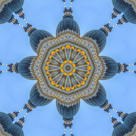 Star shape made with capital building dome. Geometric kaleidoscope pattern on mirrored axis of symmetry reflection. Colorful shapes as a wallpaper for advertising background or backdrop.