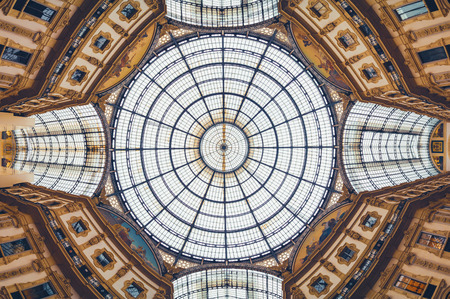 Panoramic view of Vittorio Emanuele gallery ceiling in Milan, Italy, Europe