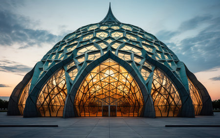 This image features a modern geometric dome structure crafted with intricate blue glass, showcasing stunning lighting effects and reflections.