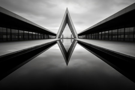 This captivating image showcases a unique architectural design featuring sharp lines and geometric shapes under an overcast sky. The modern structure emphasizes symmetry and minimalism, creating a tranquil atmosphere perfect for themes of urban exploration and innovative design.