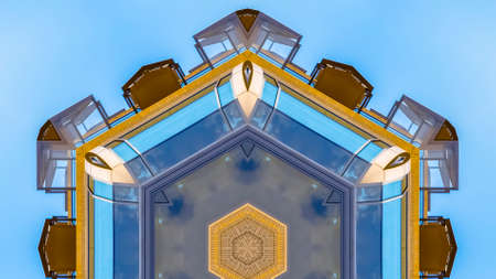Blue and white abstract background with a kaleidoscope pattern on the facade of a church