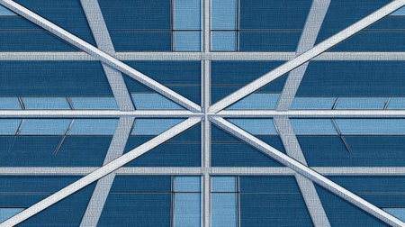 A captivating abstract view of a modern architectural structure showcasing intersecting beams and blue glass windows, emphasizing design and symmetry.