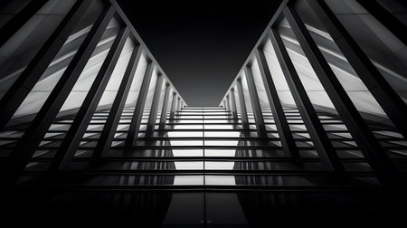 This captivating black and white line art photograph showcases a mesmerizing interplay of geometric shapes and minimalist design elements. The monochrome stripes, rendered with meticulous detail, create a dynamic visual narrative. The abstract composition invites the viewer to explore the interplay of lines, angles, and negative space. Intricate patterns emerge from the interplay of simple geometric forms, resembling a modern architectural blueprint or a complex network of interconnected pathways. The minimalist aesthetic emphasizes form over embellishment, allowing the viewer to focus on the beauty of the shapes and their harmonious arrangement. The absence of color underscores the visual impact of the strong lines and bold contrasts, creating a sophisticated and timeless aesthetic. The image's clean, crisp lines are perfect for various applications, from modern wall art to graphic design elements. The geometric shapes and minimalist design principles are ideal for posters, website backgrounds, or social media graphics. Its versatility makes it a captivating piece for anyone seeking a visually striking and sophisticated design element. The image's high level of detail allows for close examination of the intricate lines and shapes, highlighting the precision and artistry in the creation of this piece. Through its abstract nature, the artwork evokes a sense of elegance and modern sophistication.