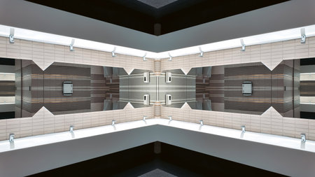 Symmetrical patterns of mirrored geometry create a hi-tech atmosphere with lines converging towards a central focal point
