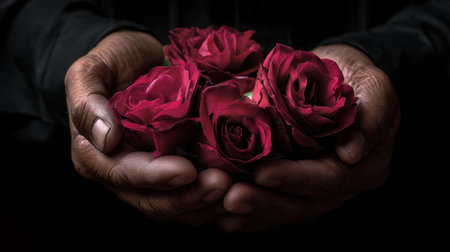 A pair of hands cradles a cluster of beautiful red roses against a dark background, symbolizing love and affection. This image captures the detail and elegance of the flowers, perfect for romantic themes or floral designs.