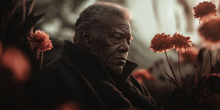 Pensive Elder in Garden Contemplative Senior Amidst Vibrant Flowers.