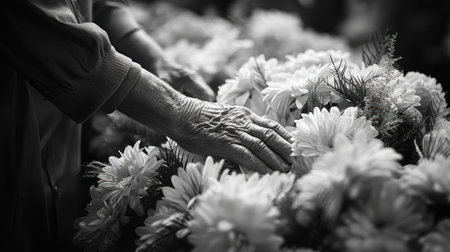 A person is caressing a bouquet of flowers in a blackandwhite photo, with a serene landscape of grass, sky, and clouds in the background