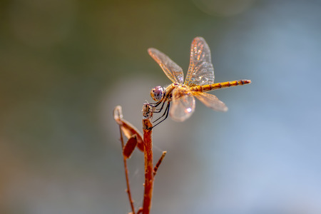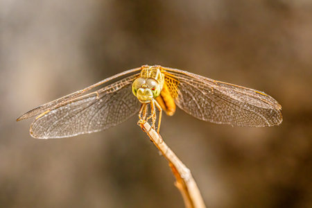 large dragonfly close-up in pastel colors. beige shade. Beautiful macro of a dragonfly sitting on a branch