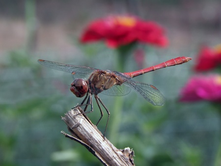 Close up of a dragonfly (Sympetrum vulgatum) on a flower.