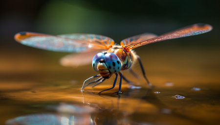 A macro shot of a dragonfly with delicate transparent wings on a flower. Generative AI illustration