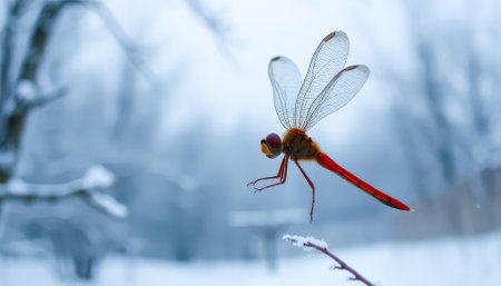 A dragonfly is flying in the snow. The image has a serene and peaceful mood, as the dragonfly is the only living creature visible in the scene. The snow-covered landscape adds to the calm atmosphere