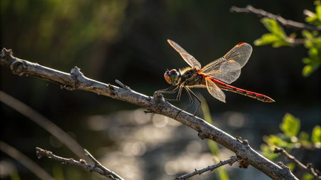 macro shot of a dragonfly perched on a twig, created with generative ai