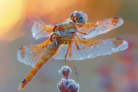 A stunning dragonfly displays its vivid colors and intricate wing patterns while perched on a plant stalk in a tranquil outdoor environment during early morning light.
