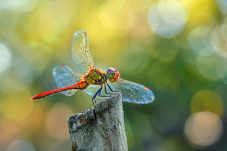 Closeup of a colorful dragonfly resting on a post with a beautiful bokeh background