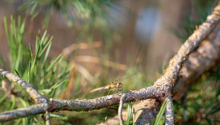 Dragonfly, on a branch in the hot afternoon. Selective focus. Copy space.
