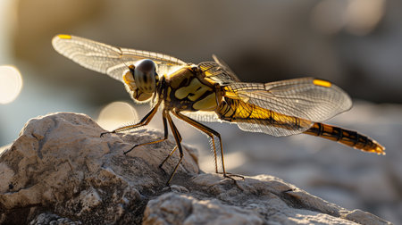 A macro shot of a dragonfly with delicate transparent wings on a flower. Generative AI illustration