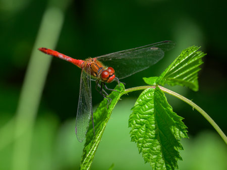 Japanese sympetrum risi yosico dragonflies, part of a family of dragonflies known as darters or meadowhawks, perches on a leaf in a Japanese park.