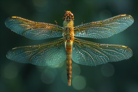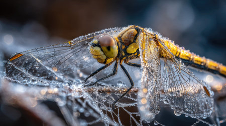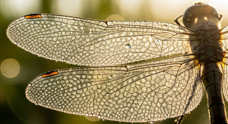 Close up of a dragonfly with dew drops on its wings
