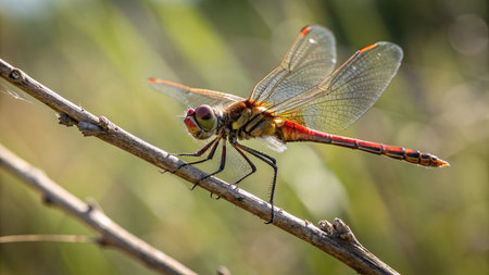 Red dragonfly sitting on a branch of a tree in the sun