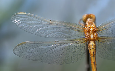 Close-up and detail shot of a dragonfly of the genus Blue Arrows (Orthetrum), photographed from above. You can see the wings in detail and part of the back.