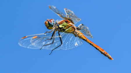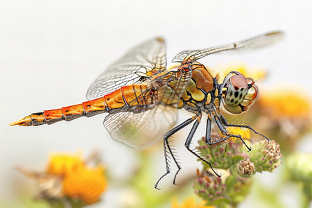 A stunning yellow and orange dragonfly hovers gracefully in midair. Its intricate wings and vibrant eyes are captured in exquisite detail.