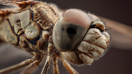 Macro shot of a dragonfly's head on a brown background