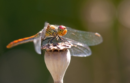 Dragon fly on dry pod of poppy flower