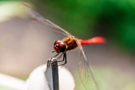 Red dragonfly close-up on a blurred background. Selective focus. Macro shooting. A beautiful insect