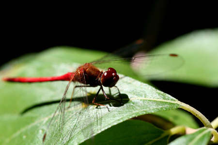 Red dragonfly sitting on a leaf and turning its head.