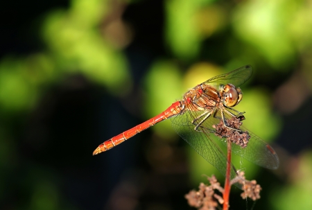 A Ruddy Darter dragonfly (Sympetrum sanguineum) resting on a plant, sunny day in summer (Austria)