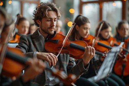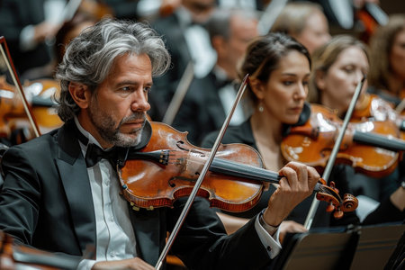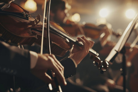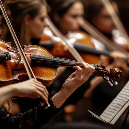 Orchestral performance concert hall music event vibrant atmosphere close-up view artistry in motion