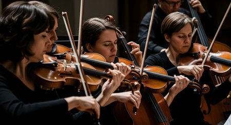 A section of female violinists and violists in an orchestra, dressed in black, concentrate intensely as they play their string instruments. The image captures the focus and precision required for a classical music performance, highlighting their teamwork and dedication.