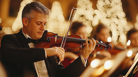 A musician is performing on a violin, a member of the string instrument family, in a classical music orchestra, providing entertainment at an event