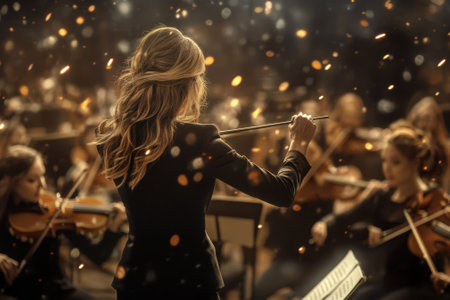 A talented conductor passionately directs a symphony orchestra, creating a magical atmosphere in a concert hall.