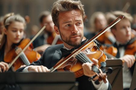 Elegant symphonic orchestra performing classical music concert with precision and elegance on stage