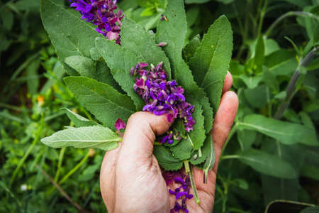 Collection of medicinal herbs. The herbalist collects sage. Herbal treatment. natural medicine. Herbal collection. Agronomist checks the quality of the crop.