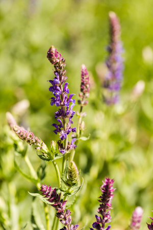 Purple flowering Sage (Salvia nemorosa) in the field, close up and selective focus