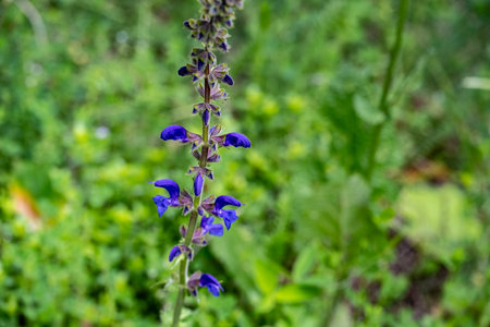Salvia plant (sage oak), ornamental plant in the flowerbed, macro photo, selective focus, blurred background.