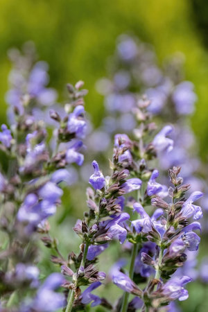 Flowers of clary (Salvia sclarea) with delicate purple blossoms on a blurred background in close-up.Sage salvia blue medicinal flower on stem bouquet