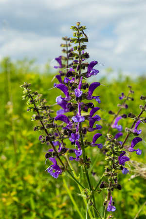 Purple flowers of wild meadow sage in wild. Wild Salvia on a summer day sways the breeze. Salvia pratensis