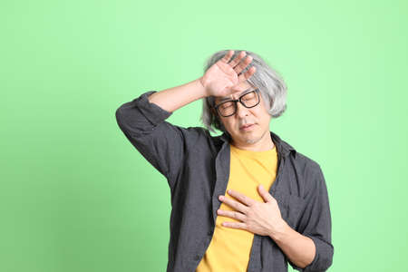 The senior Asian man with smart casual dressed standing against the light green background.