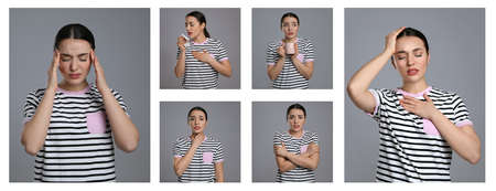 Collage with photos of woman with cold symptoms on white background. banner design