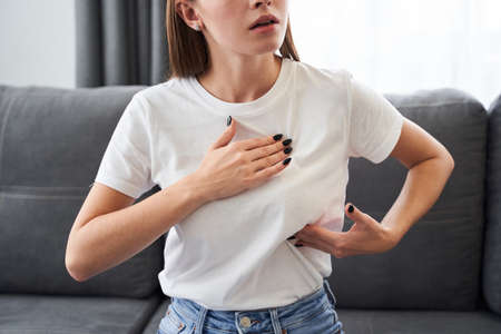 Aches and pains concept. Sick woman having bad ache and pain heart attack health problem. Female placing hands on her chest.