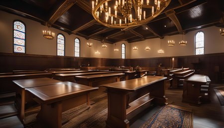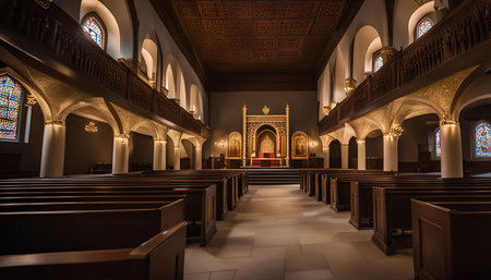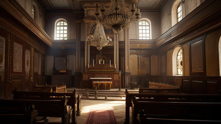 A detailed interior view featuring an ornate archway with a golden chandelier, stained glass windows, and rows of wooden pews, illuminated by soft lighting, Jerusalem synagogue, Jerusalem synagogue