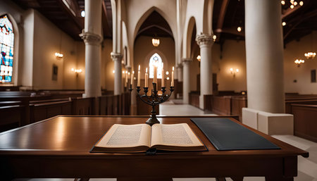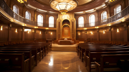 Shofar is prominently displayed on a wooden podium in a beautifully designed synagogue, surrounded by stained glass and chandeliers, representing Jewish heritage and faith
