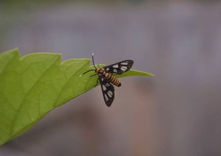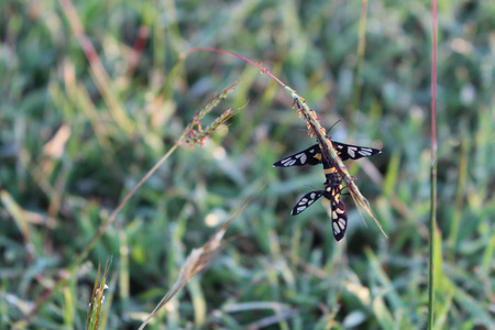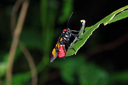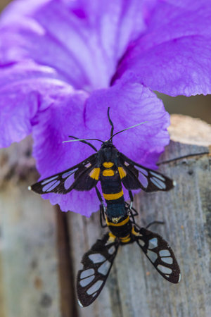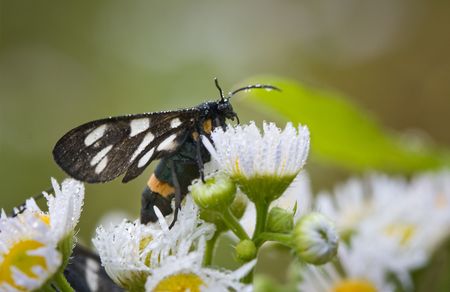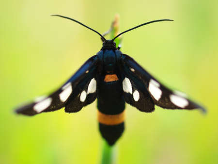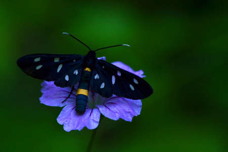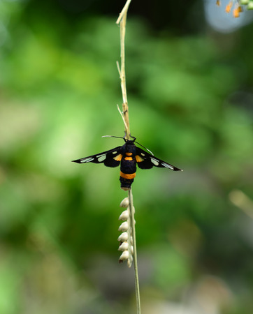 Amata fortunei (Japanese nine-spotted moth). Arthropoda Lepidoptera Arctiidae Syntominae Noth. It has black wings with white spots and part of its abdomen is yellow.