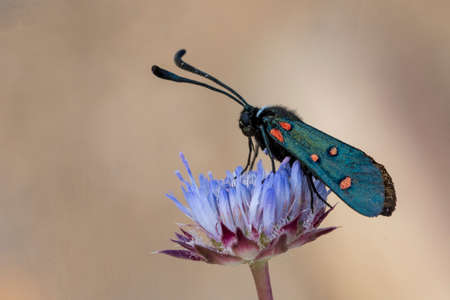 Six-spot Burnet (Zygaena filipendulae) moth sitting on pink flower in Zurich, Switzerland